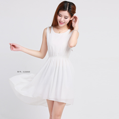 储恋2014夏装新款白色飘仙双吊带肩不对称收腰连衣裙