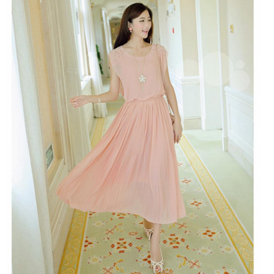 依贝尔百褶雪纺连衣裙无袖钉珠长裙清新复古宽松连衣裙