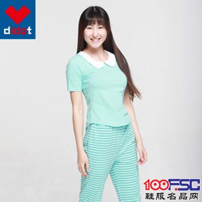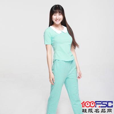 didot迪渡女士家居服睡衣套装短袖绿白条纹长裤内衣2件套