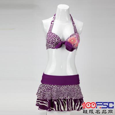 号手品牌泳衣 小胸聚拢加厚带钢托带胸垫 豹纹分体裙式比基尼套装