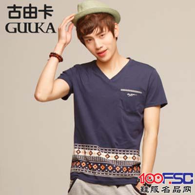 古由卡夏季男式T恤 男士V领印花欧美拼接短袖T恤