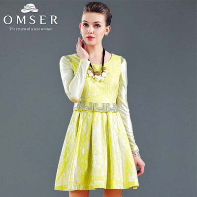 欧魅赛尔2014冬装新款欧美水墨印染假两件透视蕾丝长袖连衣裙
