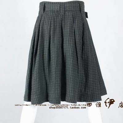 ANY-ALL必然Q013森女风舒适亚麻格子加褶宽松圆摆花苞裙