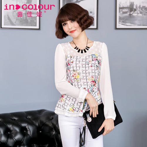 茵佳妮女装春装新款2015甜美学院圆领修身泡泡袖荷叶下摆长袖衬衫