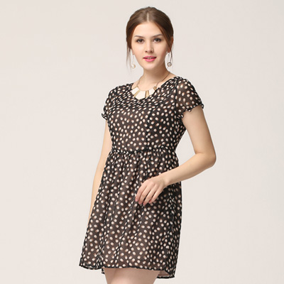 Phidias菲迪雅丝 春季新款女装黑色波点圆领短袖收腰修身连衣裙