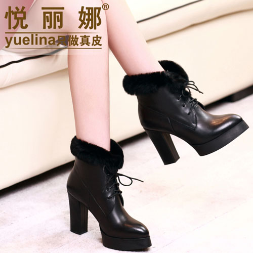 悦丽娜2014冬新款欧美马丁靴粗跟女短靴高跟靴复古系带兔毛短筒靴
