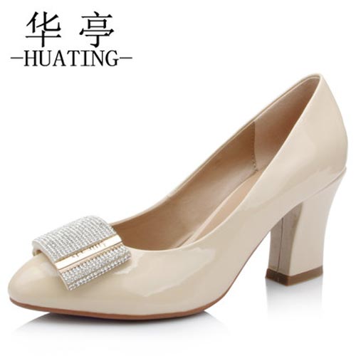 HT/华亭2015春季新款时尚女单鞋真皮水钻白色粗高跟女鞋