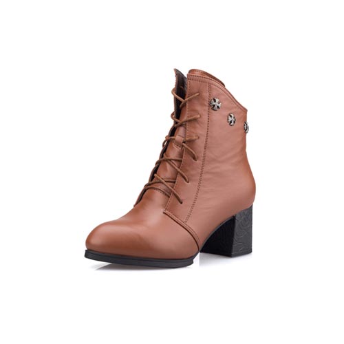 登云女鞋 牛皮圆头中跟短靴