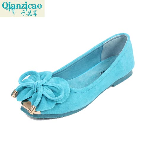 千姿草真皮女鞋金属方头蝴蝶结花朵平底平跟单鞋大码豆豆鞋