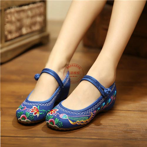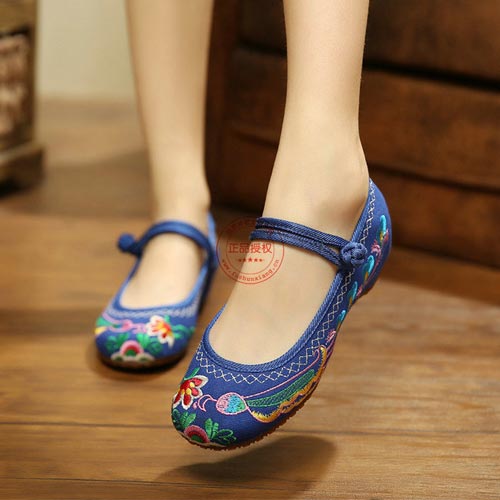 福顺祥老北京布鞋经典款一字式扣带优雅坡跟牛筋底绣花鞋