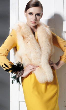 卡特丽时尚女装黄色皮皮草毛领长款呢大衣新款