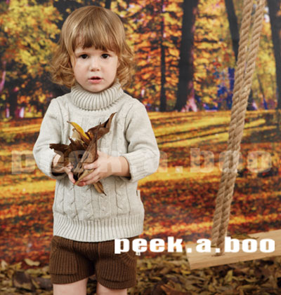 利益:时尚舒适 方便 安全——采用健康环保面料,倡导绿色与安全,结合孩子健康成长的需求,服装色彩自然柔和,体现了孩子时尚与健康的结合。Peek.a.boo不仅要为孩子提供好的产品,更致力于为孩子塑造一个全新的生活与社交方式。