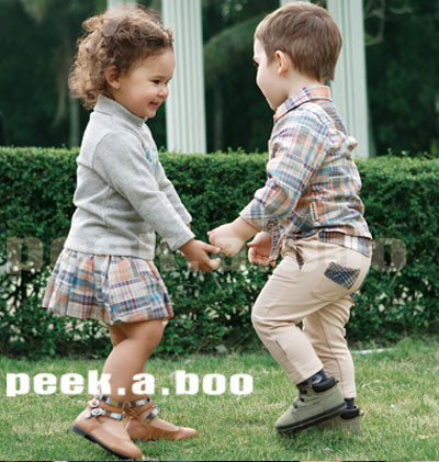 利益:时尚舒适 方便 安全——采用健康环保面料,倡导绿色与安全,结合孩子健康成长的需求,服装色彩自然柔和,体现了孩子时尚与健康的结合。Peek.a.boo不仅要为孩子提供好的产品,更致力于为孩子塑造一个全新的生活与社交方式。