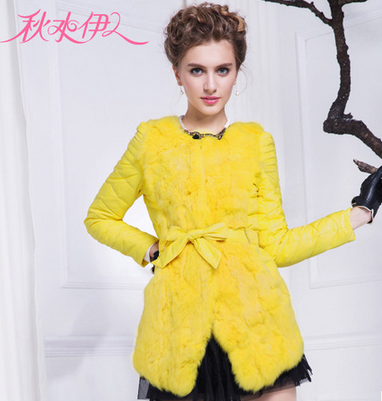 秋水伊人2013冬装新款女装PU包边拼接貉子毛口袋