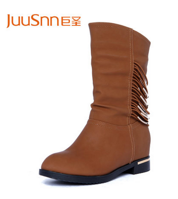 巨圣新款2013秋靴子女鞋内增高中筒靴平跟金属装